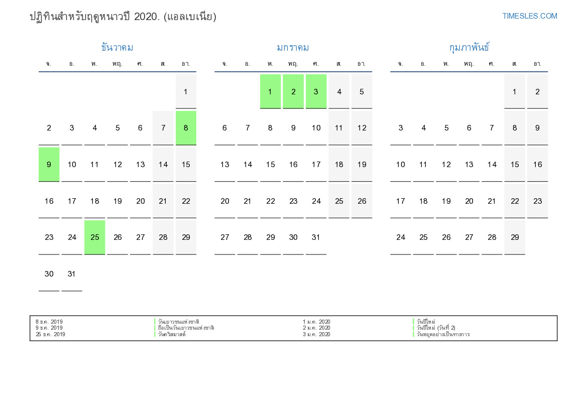 ปฏิทินแนวนอนวันหยุด