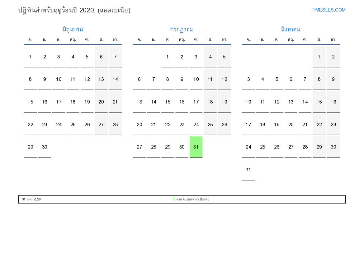 ดาวน์โหลดและพิมพ์ปฏิทิน PDF พร้อมวันหยุดและวันหยุดสุดสัปดาห์สำหรับฤดูร้อนปี 2020 สำหรับแอลเบเนีย
