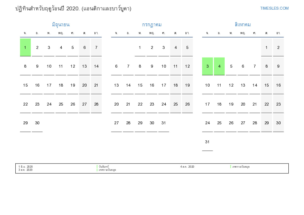 ปฏิทินสำหรับฤดูร้อนปี 2020 สำหรับแอนติกาและบาร์บูดา