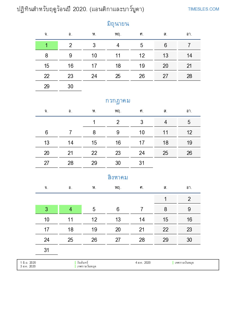 ดาวน์โหลดและพิมพ์ปฏิทิน PDF พร้อมวันหยุดและวันหยุดสุดสัปดาห์สำหรับฤดูร้อนปี 2020 สำหรับแอนติกาและบาร์บูดา