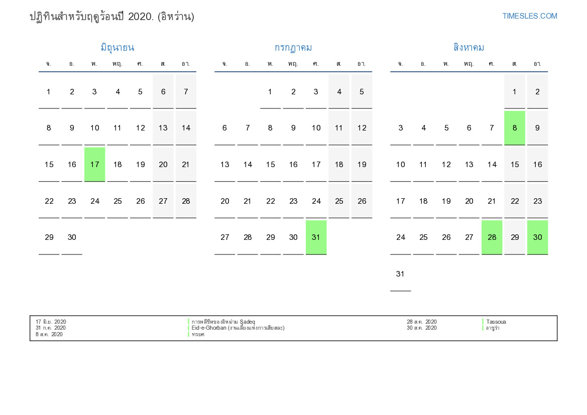 ดาวน์โหลดและพิมพ์ปฏิทิน PDF พร้อมวันหยุดและวันหยุดสุดสัปดาห์สำหรับฤดูร้อนปี 2020 สำหรับอิหร่าน