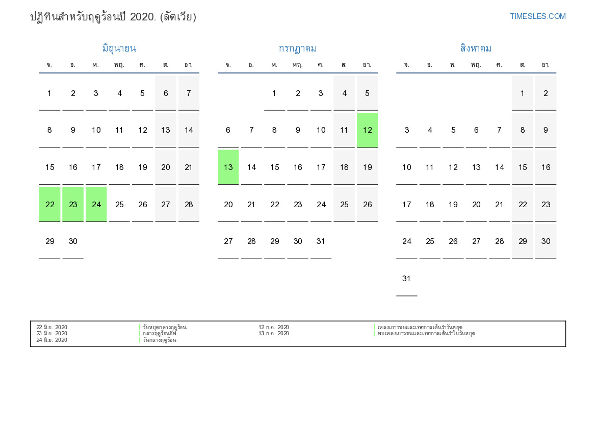 ปฏิทินสำหรับฤดูร้อนปี 2020 สำหรับลัตเวีย