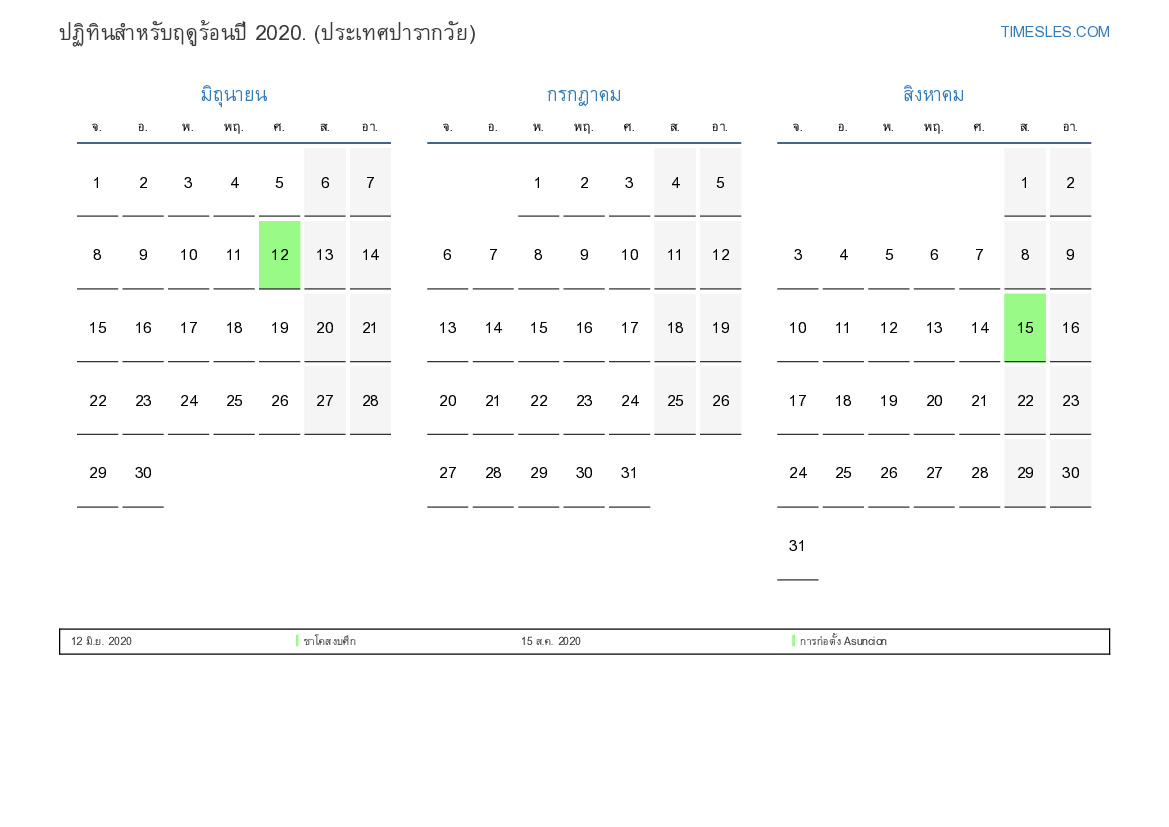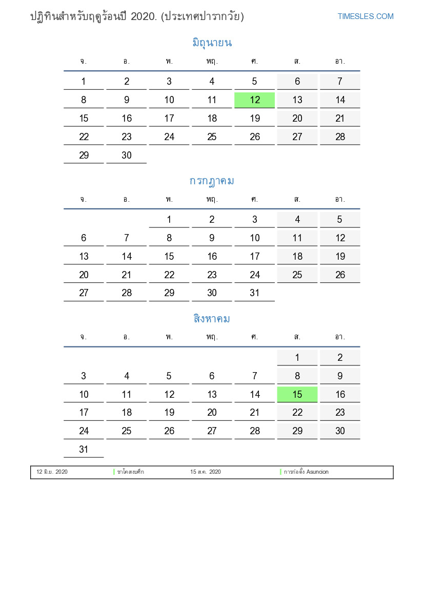 ปฏิทินสำหรับฤดูร้อนปี 2020 สำหรับปารากวัย