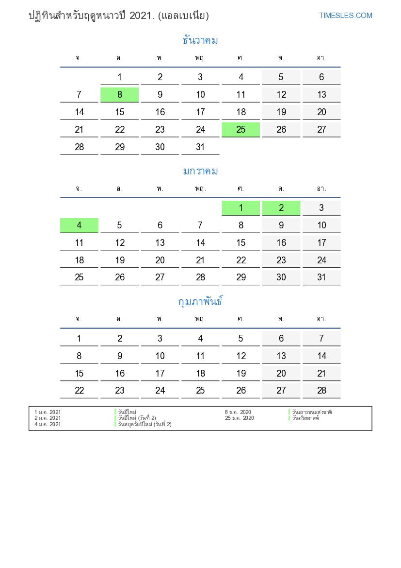 ปฏิทินแนวนอนโดยไม่มีวันหยุด