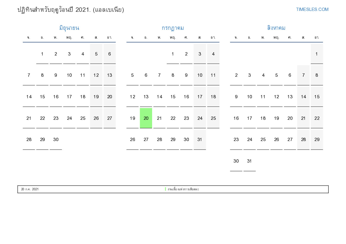ปฏิทินสำหรับฤดูร้อนปี 2021 สำหรับแอลเบเนีย