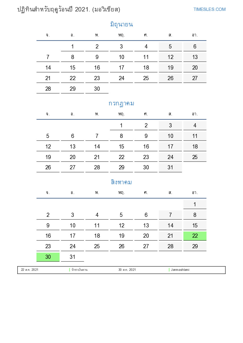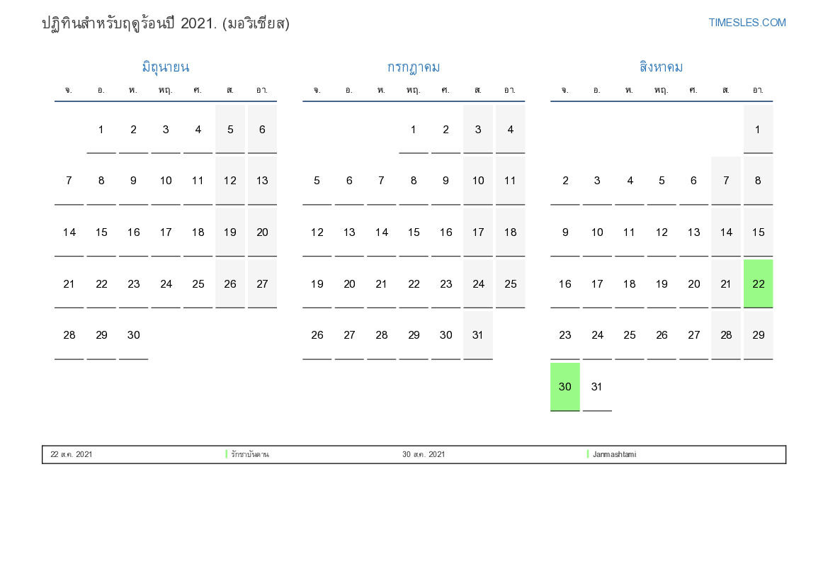ดาวน์โหลดและพิมพ์ปฏิทิน PDF พร้อมวันหยุดและวันหยุดสุดสัปดาห์สำหรับฤดูร้อนปี 2021 สำหรับมอริเชียส