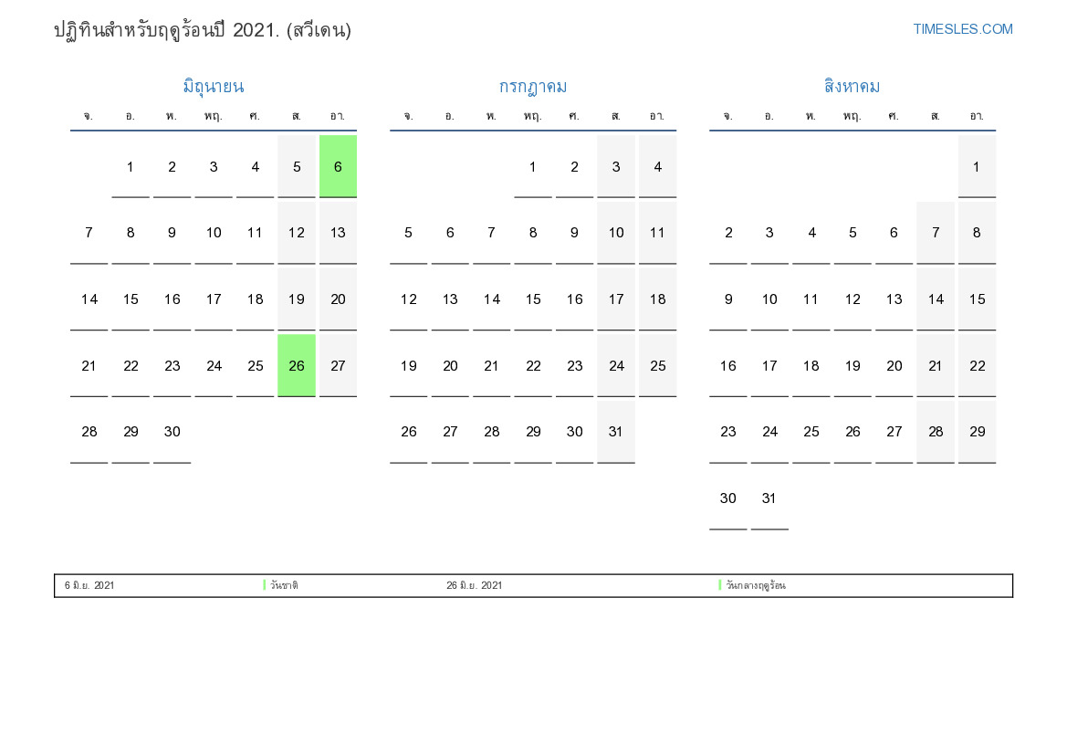 ปฏิทินสำหรับฤดูร้อนปี 2021 สำหรับสวีเดน