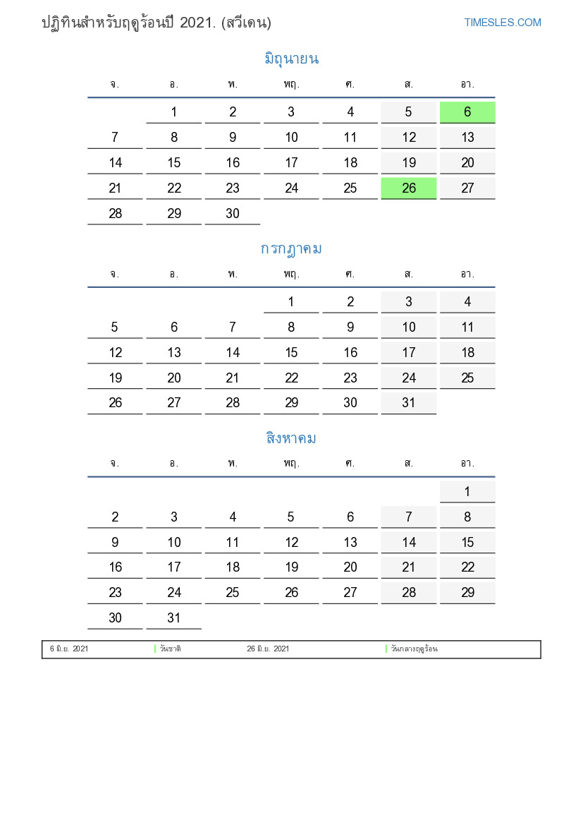 ดาวน์โหลดและพิมพ์ปฏิทิน PDF พร้อมวันหยุดและวันหยุดสุดสัปดาห์สำหรับฤดูร้อนปี 2021 สำหรับสวีเดน