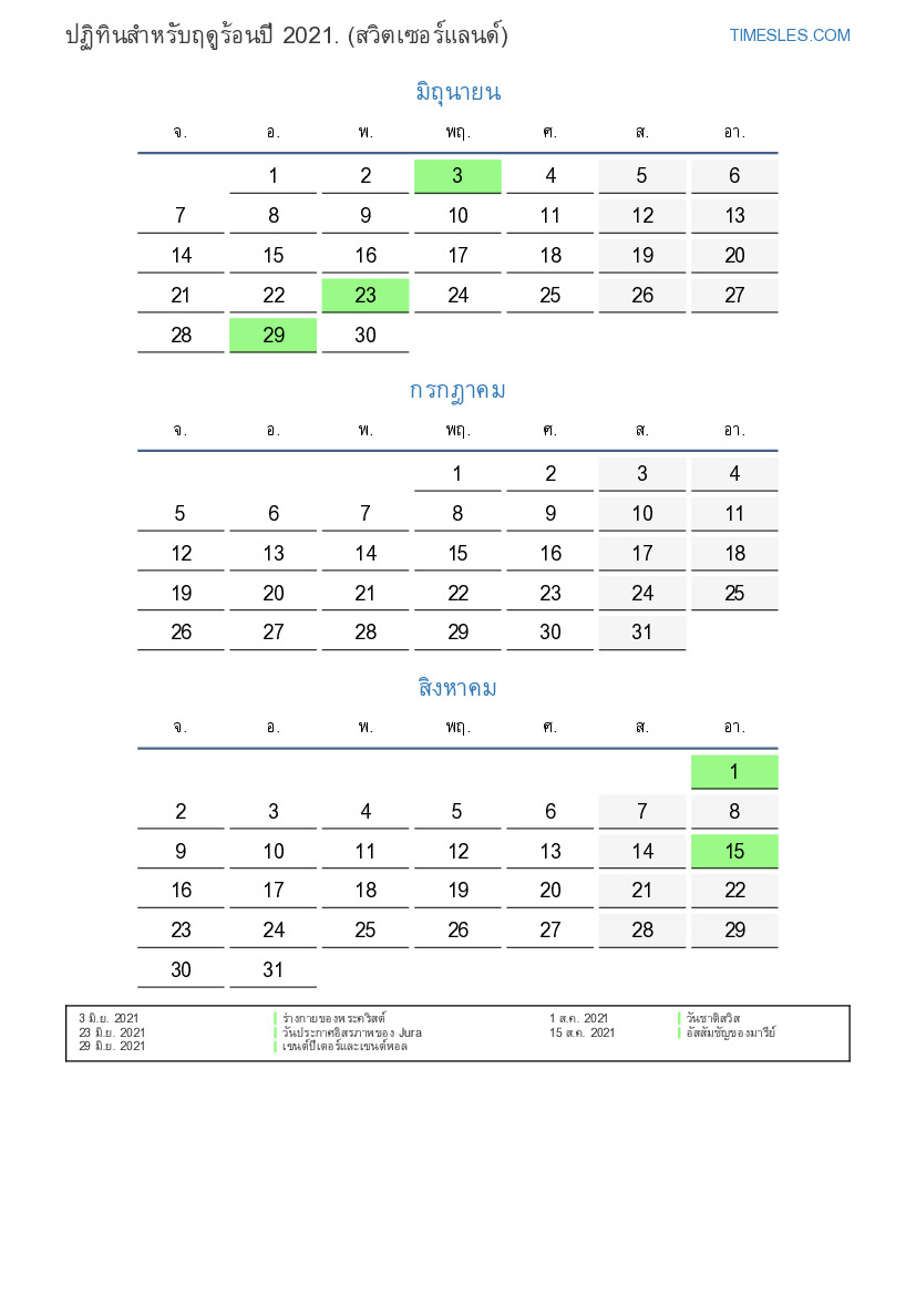 ปฏิทินสำหรับฤดูร้อนปี 2021 สำหรับสวิตเซอร์แลนด์
