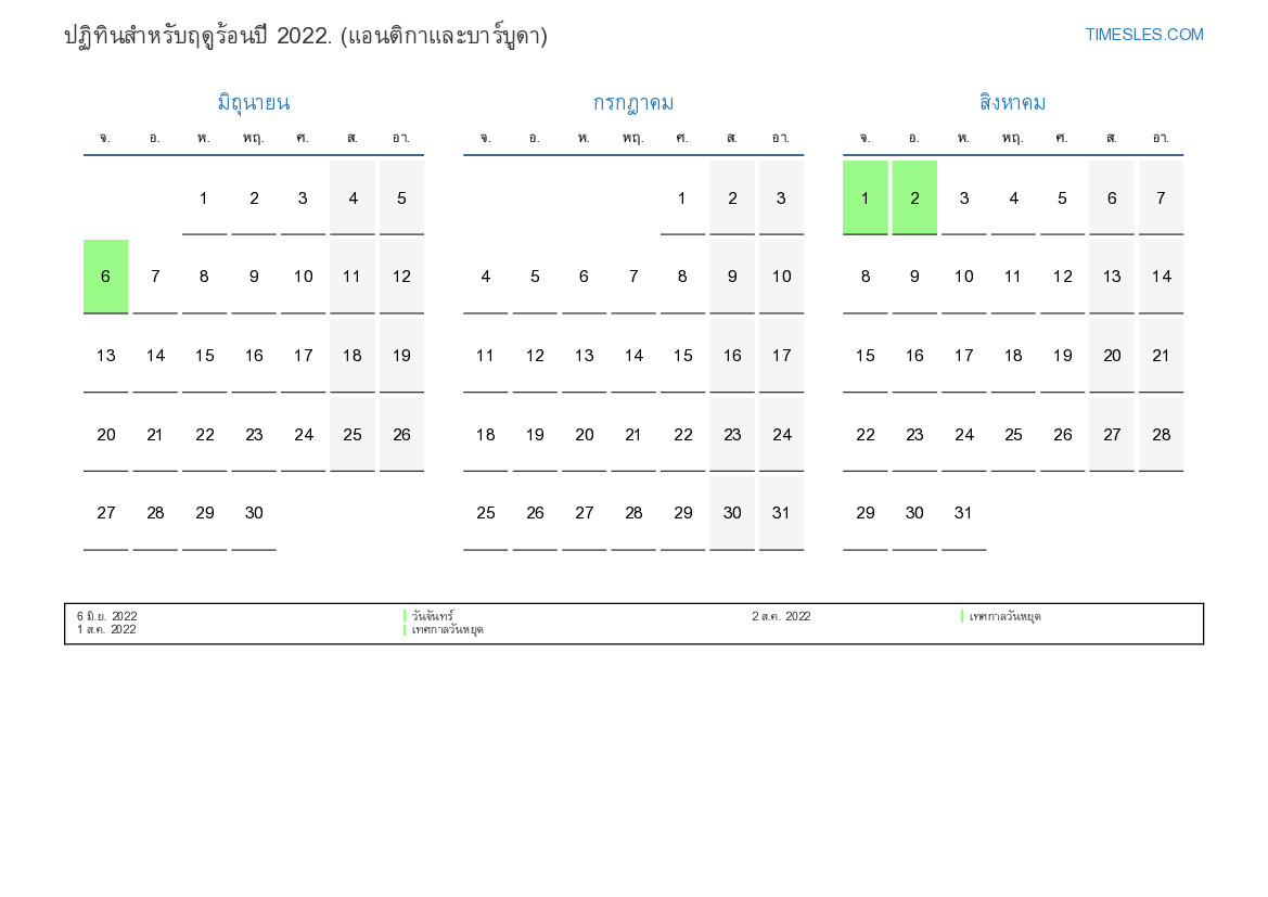 ปฏิทินสำหรับฤดูร้อนปี 2022 สำหรับแอนติกาและบาร์บูดา