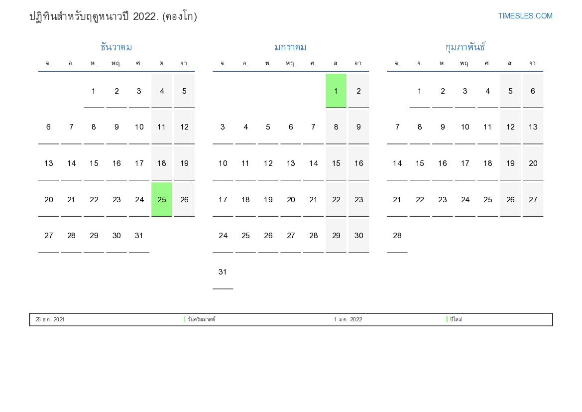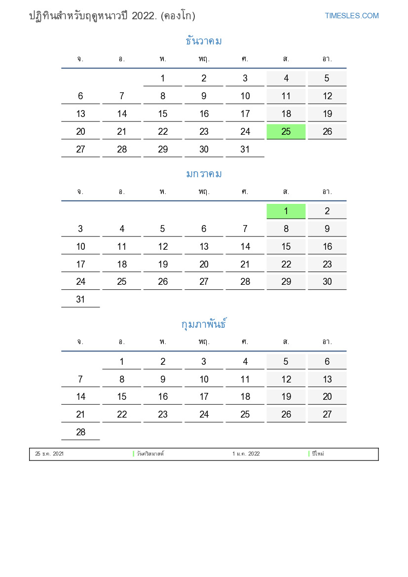 ปฏิทินแนวตั้งโดยไม่มีวันหยุด