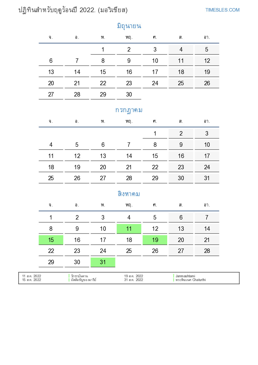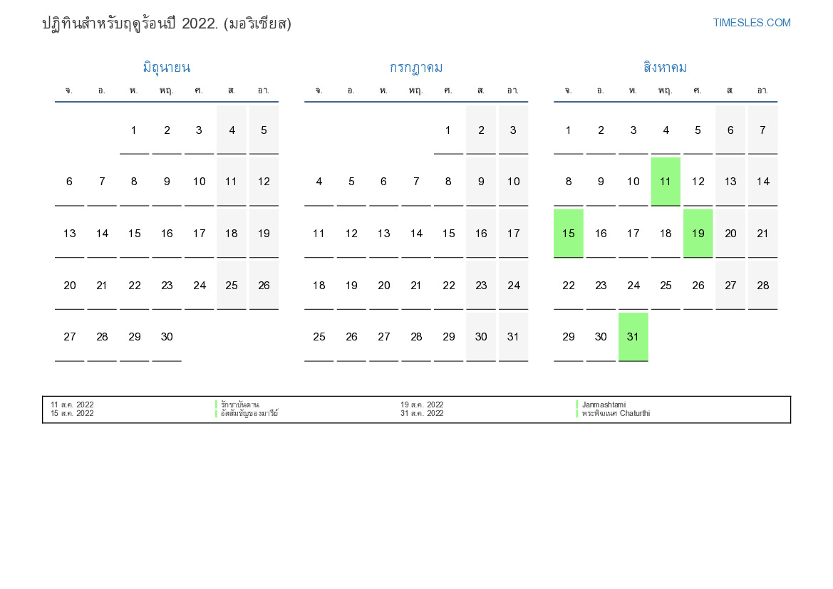 ปฏิทินสำหรับฤดูร้อนปี 2022 สำหรับมอริเชียส