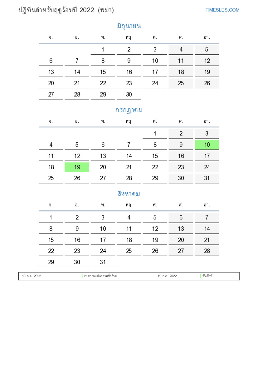 ปฏิทินสำหรับฤดูร้อนปี 2022 สำหรับเมียนมาร์