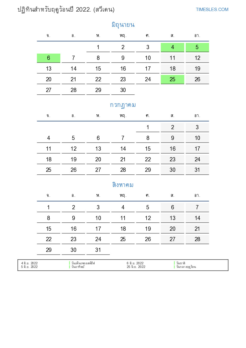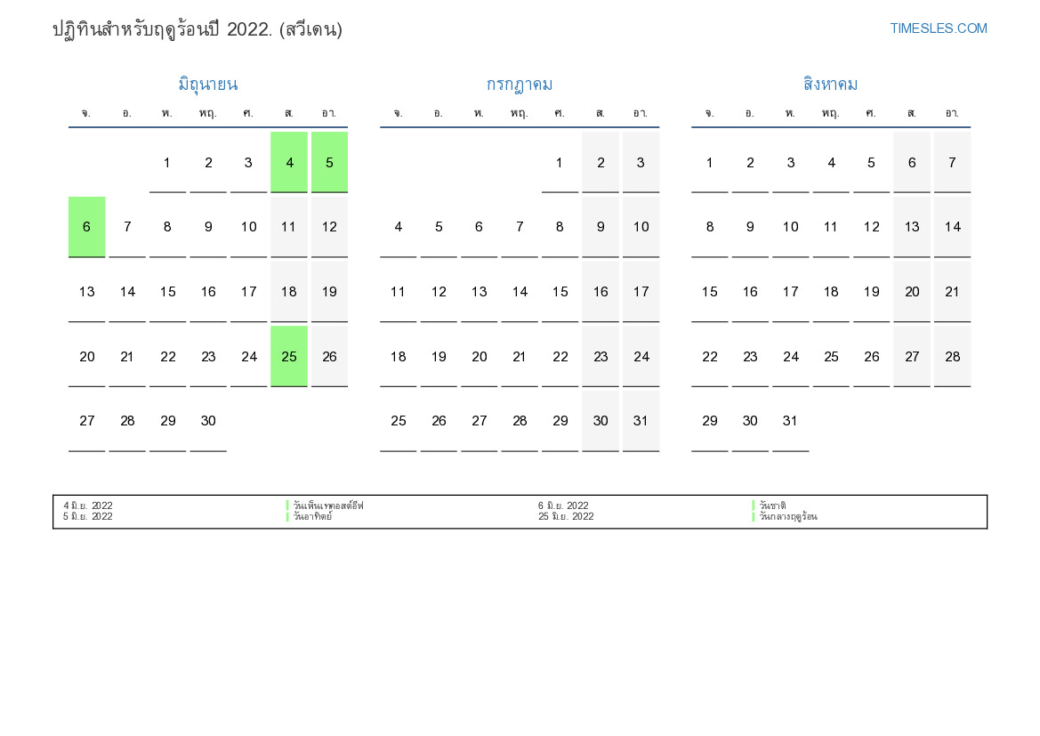 ปฏิทินสำหรับฤดูร้อนปี 2022 สำหรับสวีเดน