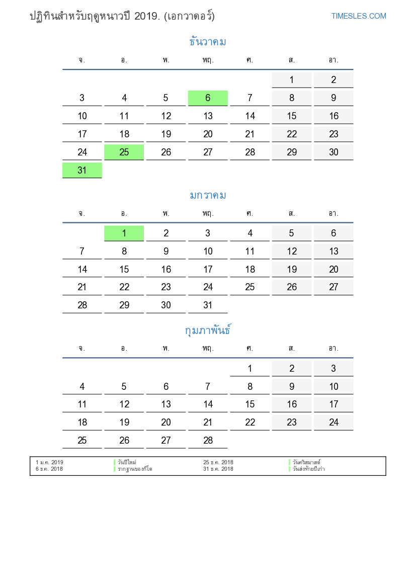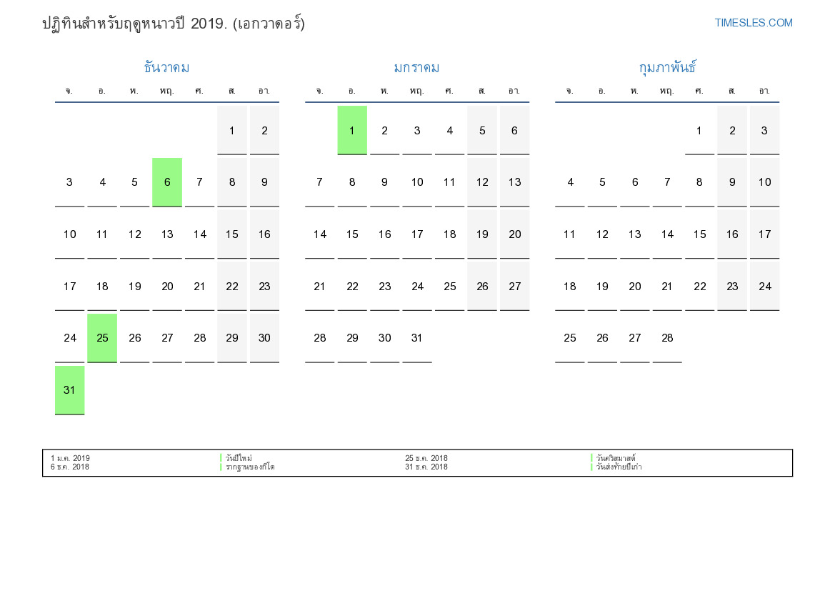 ดาวน์โหลดและพิมพ์ปฏิทิน PDF พร้อมวันหยุดและวันหยุดสุดสัปดาห์สำหรับฤดูหนาวปี 2019 สำหรับเอกวาดอร์