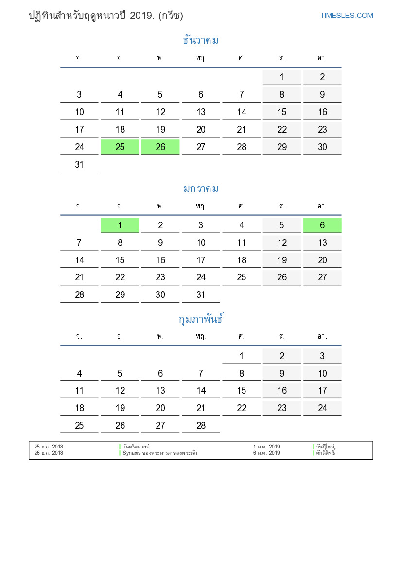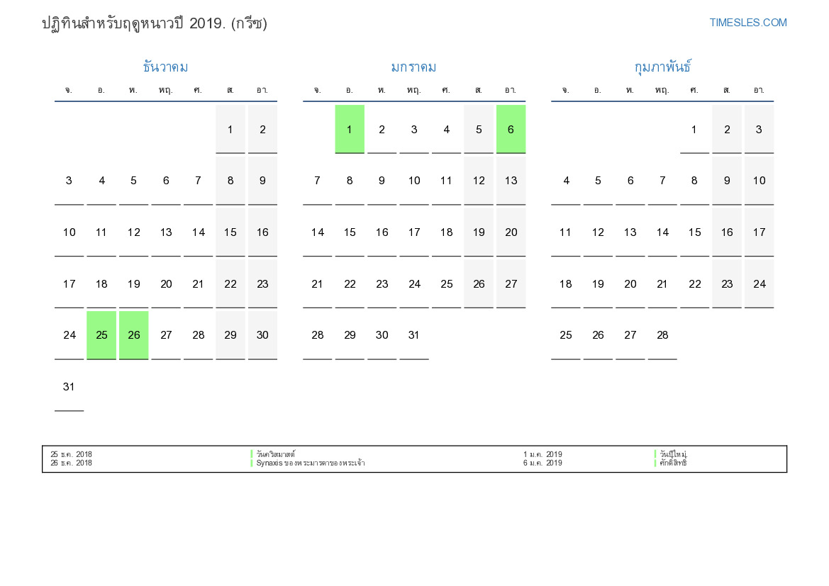 ปฏิทินวันหยุดและวันหยุดสุดสัปดาห์สำหรับฤดูหนาวปี 2019 สำหรับกรีซ