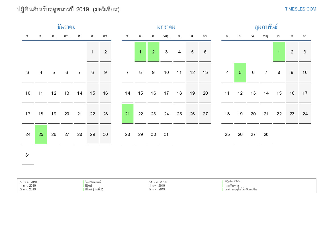 ดาวน์โหลดและพิมพ์ปฏิทิน PDF พร้อมวันหยุดและวันหยุดสุดสัปดาห์สำหรับฤดูหนาวปี 2019 สำหรับมอริเชียส