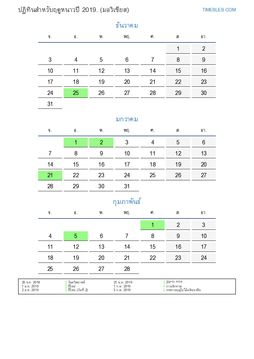 ปฏิทินวันหยุดและวันหยุดสุดสัปดาห์สำหรับฤดูหนาวปี 2019 สำหรับมอริเชียส