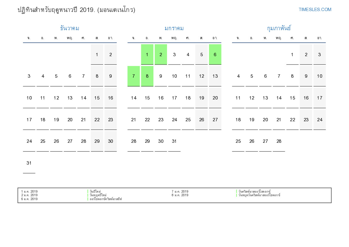 ปฏิทินวันหยุดและวันหยุดสุดสัปดาห์สำหรับฤดูหนาวปี 2019 สำหรับมอนเตเนโกร