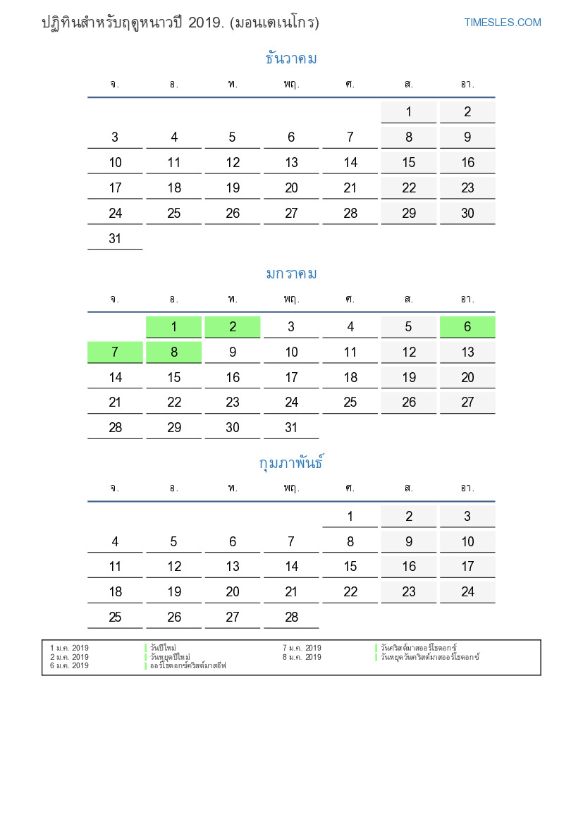 ดาวน์โหลดและพิมพ์ปฏิทิน PDF พร้อมวันหยุดและวันหยุดสุดสัปดาห์สำหรับฤดูหนาวปี 2019 สำหรับมอนเตเนโกร