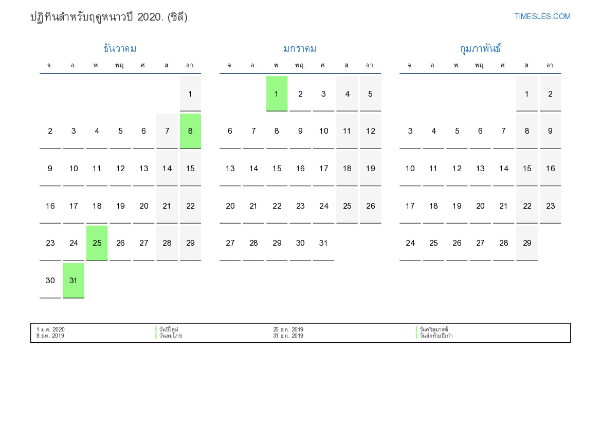 ปฏิทินสำหรับฤดูหนาวปี 2020 สำหรับชิลี