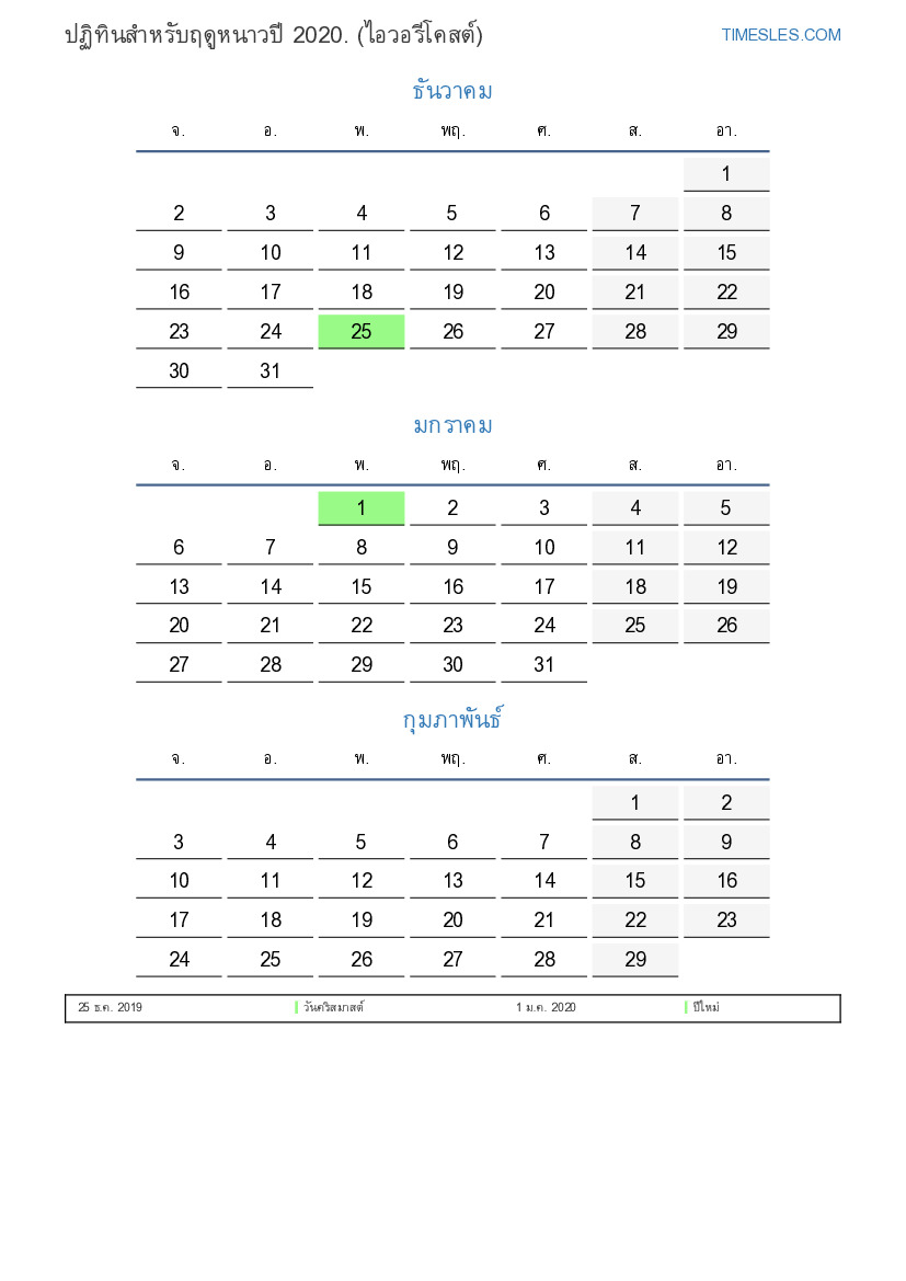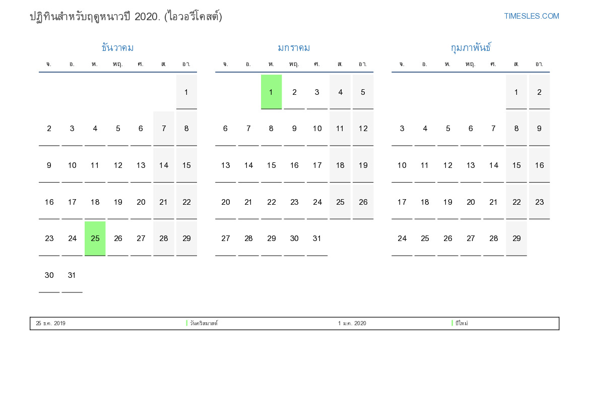 ดาวน์โหลดและพิมพ์ปฏิทิน PDF พร้อมวันหยุดและวันหยุดสุดสัปดาห์สำหรับฤดูหนาวปี 2020 สำหรับโกตดิวัวร์