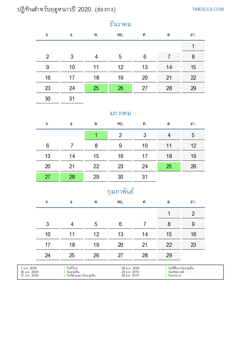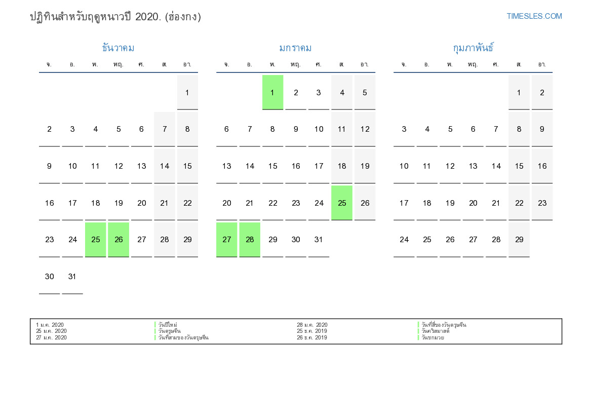 ปฏิทินสำหรับฤดูหนาวปี 2020 สำหรับฮ่องกง