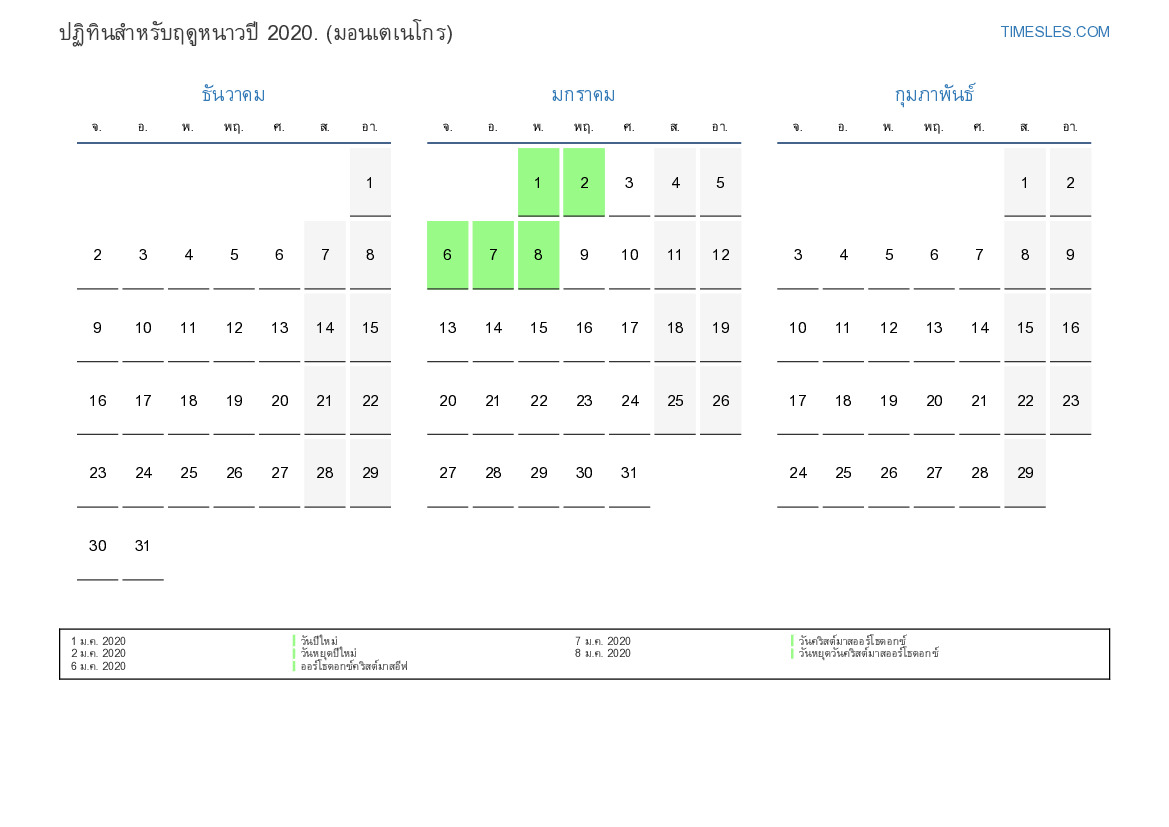 ปฏิทินวันหยุดและวันหยุดสุดสัปดาห์สำหรับฤดูหนาวปี 2020 สำหรับมอนเตเนโกร