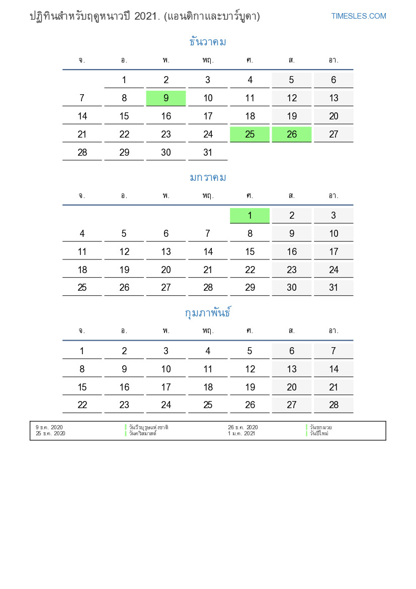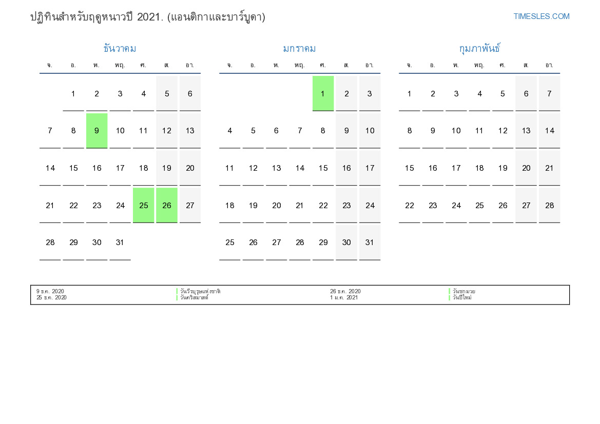 ดาวน์โหลดและพิมพ์ปฏิทิน PDF พร้อมวันหยุดและวันหยุดสุดสัปดาห์สำหรับฤดูหนาวปี 2021 สำหรับแอนติกาและบาร์บูดา