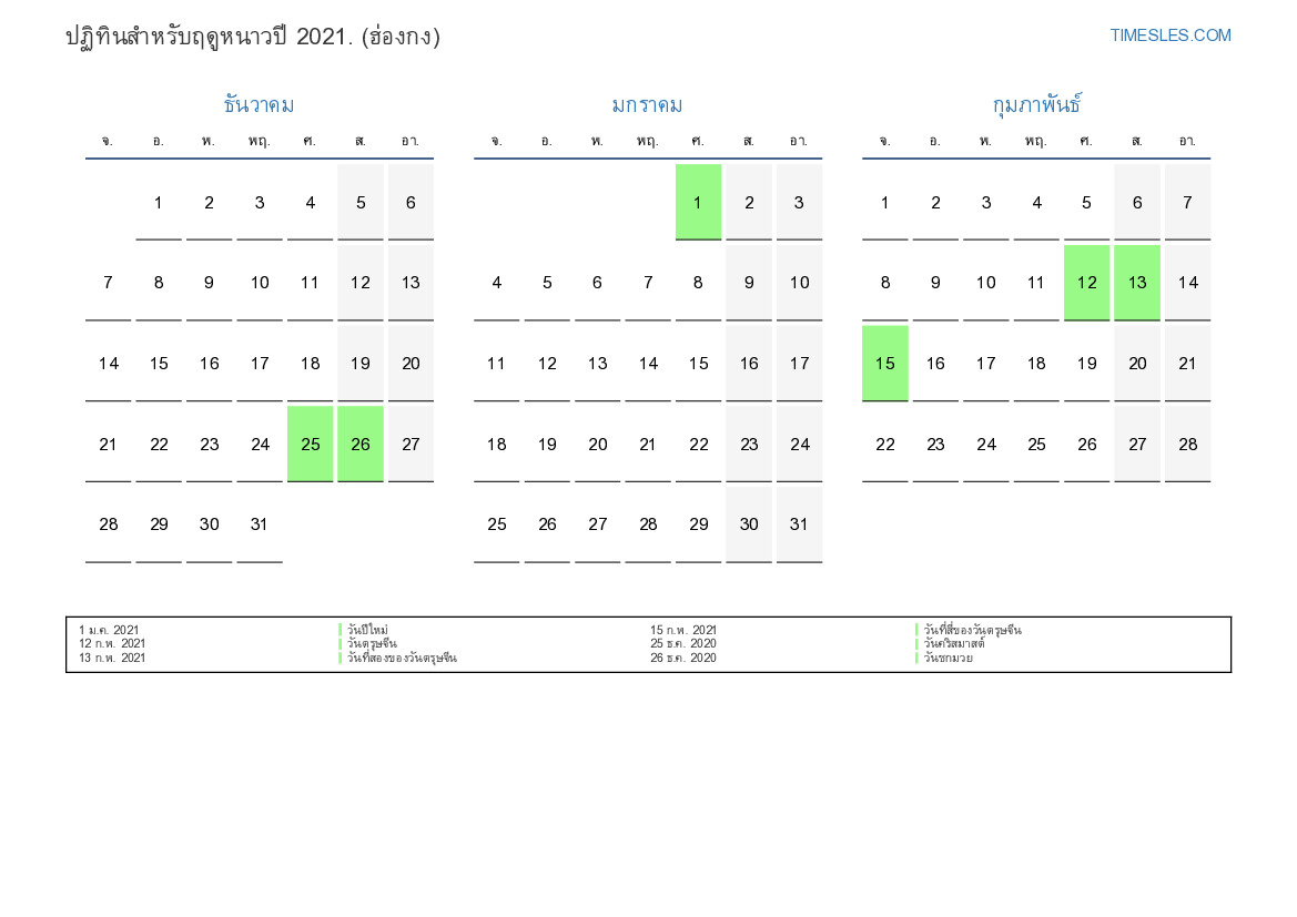 ดาวน์โหลดและพิมพ์ปฏิทิน PDF พร้อมวันหยุดและวันหยุดสุดสัปดาห์สำหรับฤดูหนาวปี 2021 สำหรับฮ่องกง