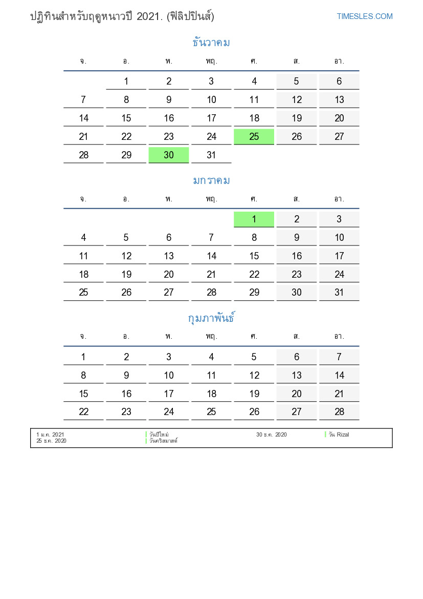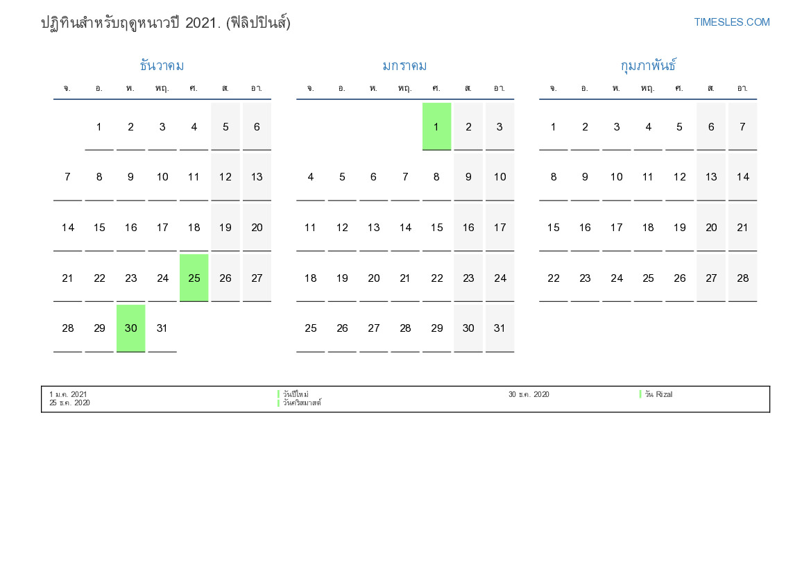 ปฏิทินสำหรับฤดูหนาวปี 2021 สำหรับฟิลิปปินส์