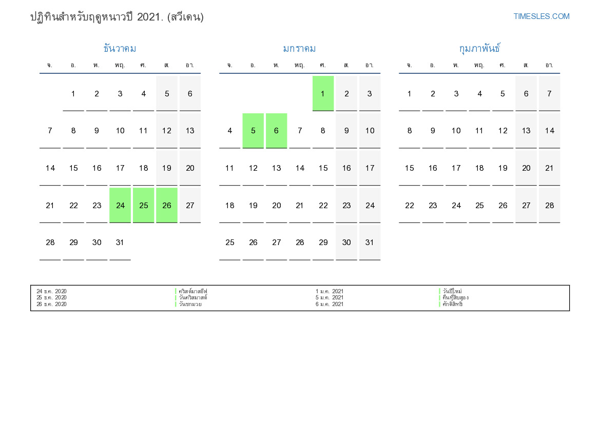 ดาวน์โหลดและพิมพ์ปฏิทิน PDF พร้อมวันหยุดและวันหยุดสุดสัปดาห์สำหรับฤดูหนาวปี 2021 สำหรับสวีเดน