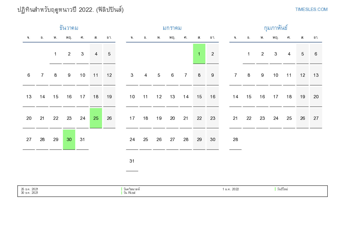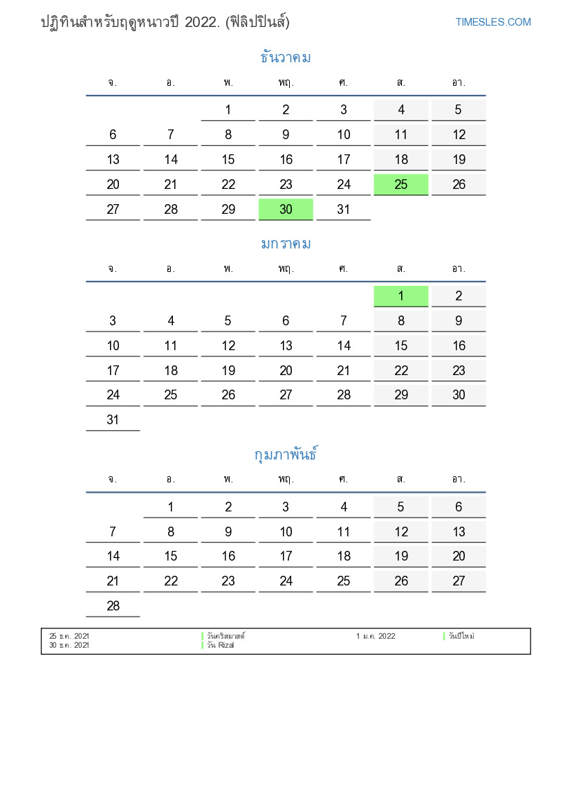 ปฏิทินสำหรับฤดูหนาวปี 2022 สำหรับฟิลิปปินส์