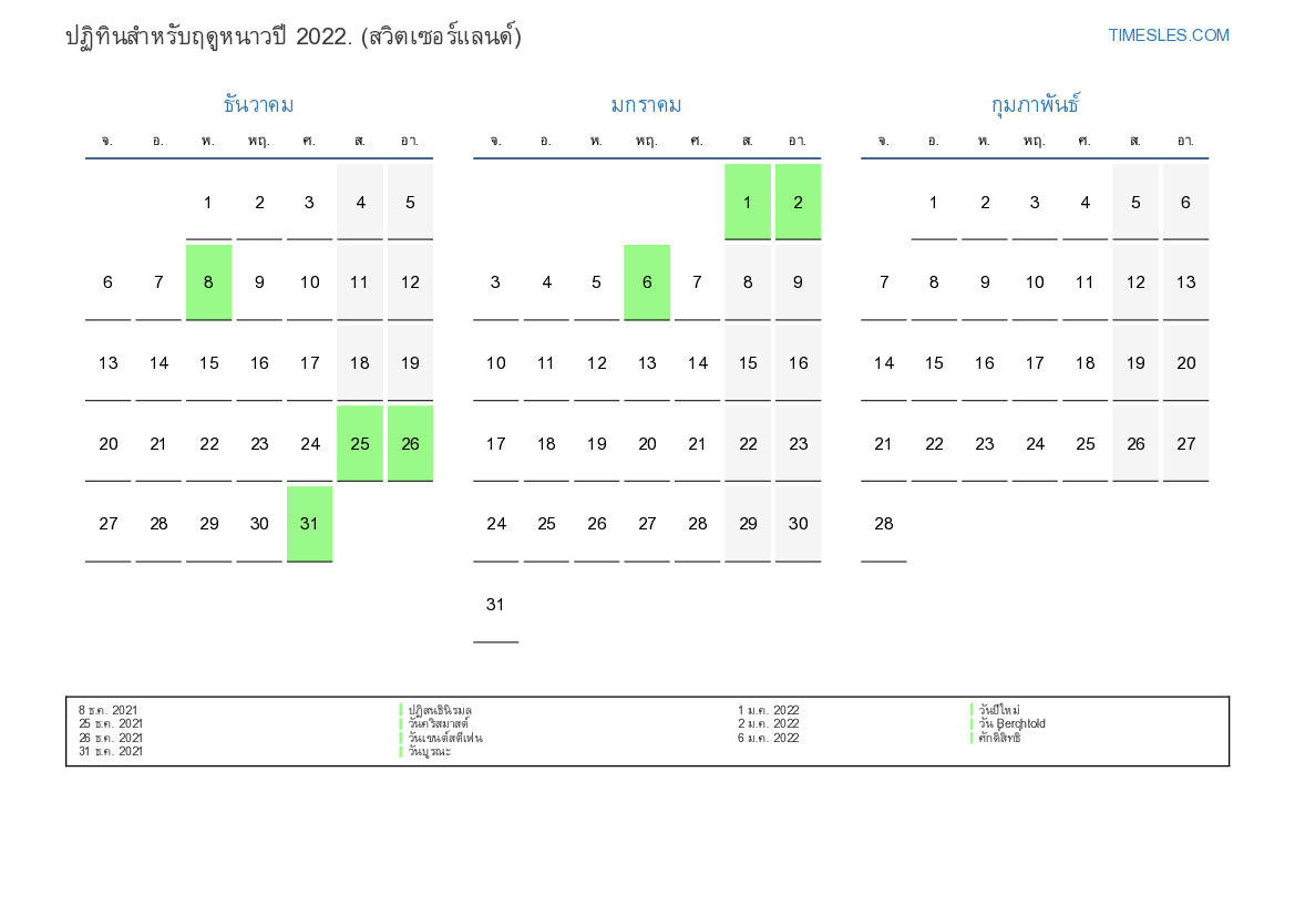 ปฏิทินวันหยุดและวันหยุดสุดสัปดาห์สำหรับฤดูหนาวปี 2022 สำหรับสวิตเซอร์แลนด์