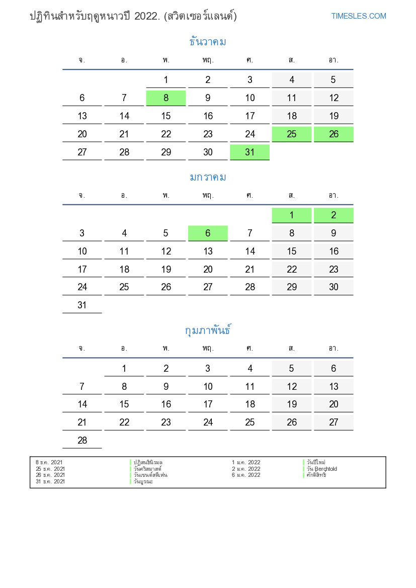 ดาวน์โหลดและพิมพ์ปฏิทิน PDF พร้อมวันหยุดและวันหยุดสุดสัปดาห์สำหรับฤดูหนาวปี 2022 สำหรับสวิตเซอร์แลนด์