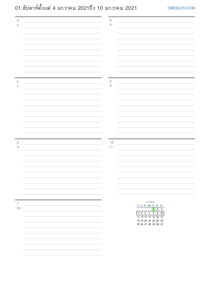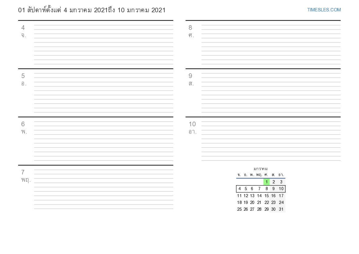 ดาวน์โหลดและพิมพ์ปฏิทิน PDF รายสัปดาห์สำหรับ 01 สัปดาห์ของปี 2021 ตั้งแต่ 4 มกราคม 2021ถึง 10 มกราคม 2021