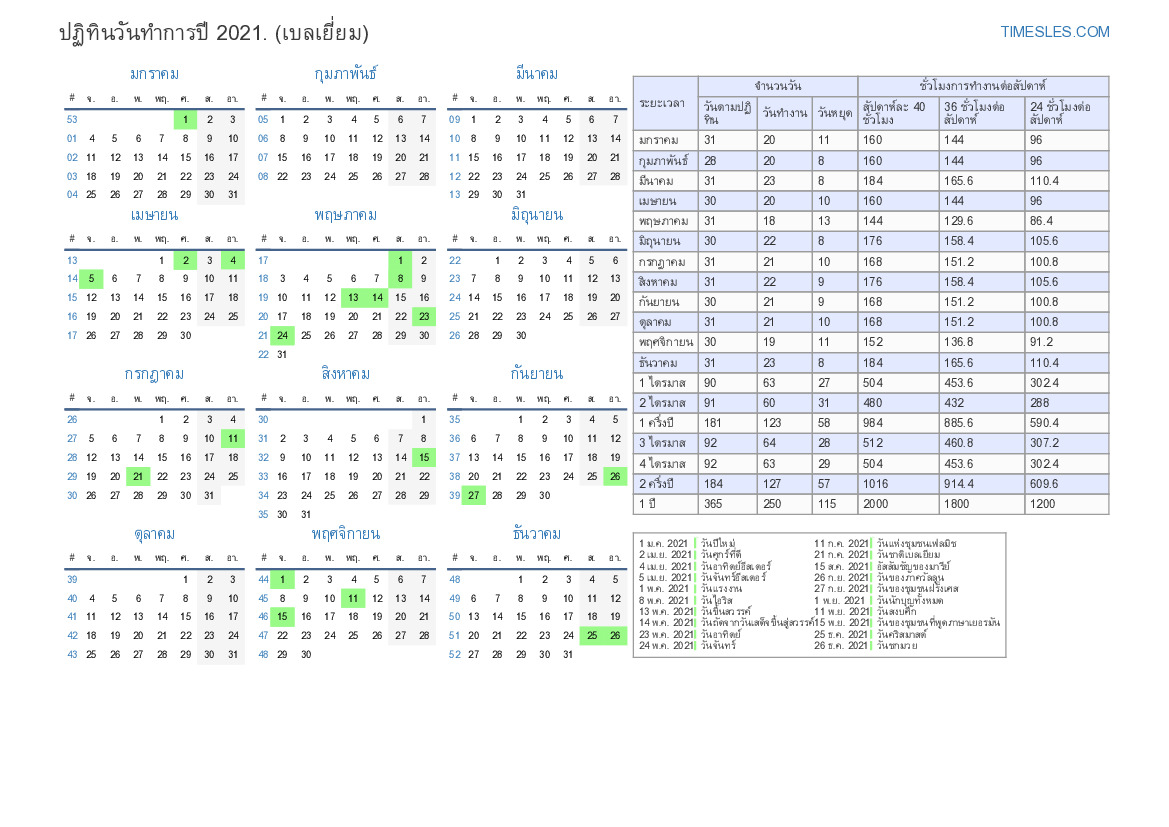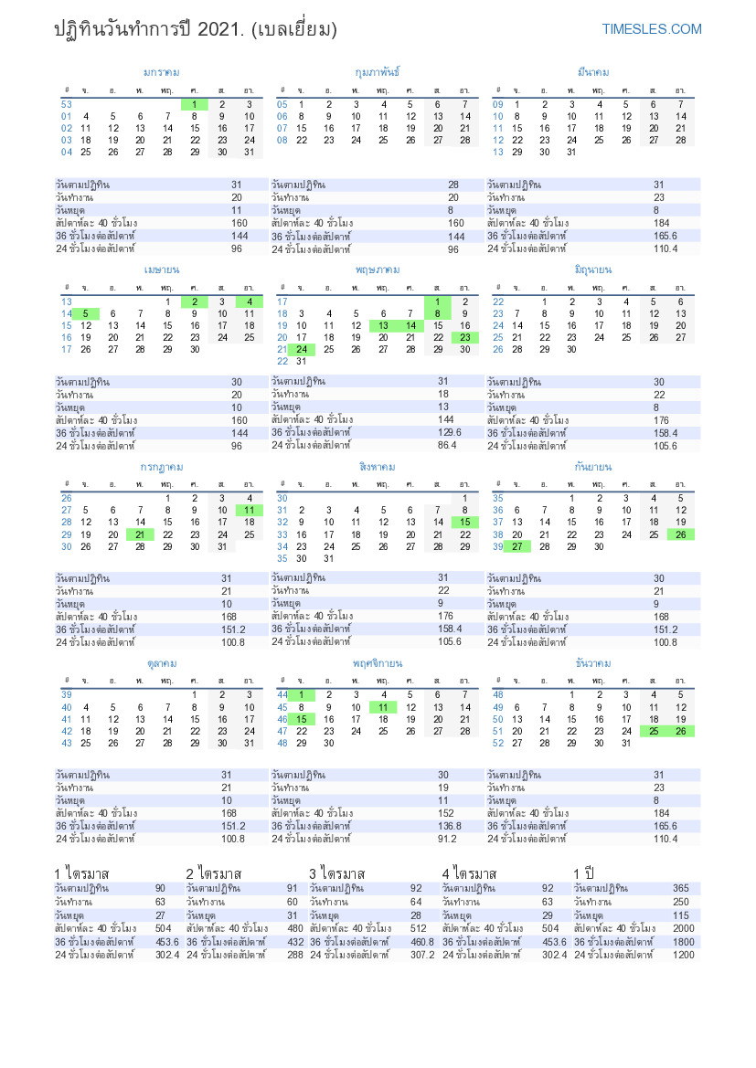 ปฏิทินวันทำงานแนวนอนสำหรับปี