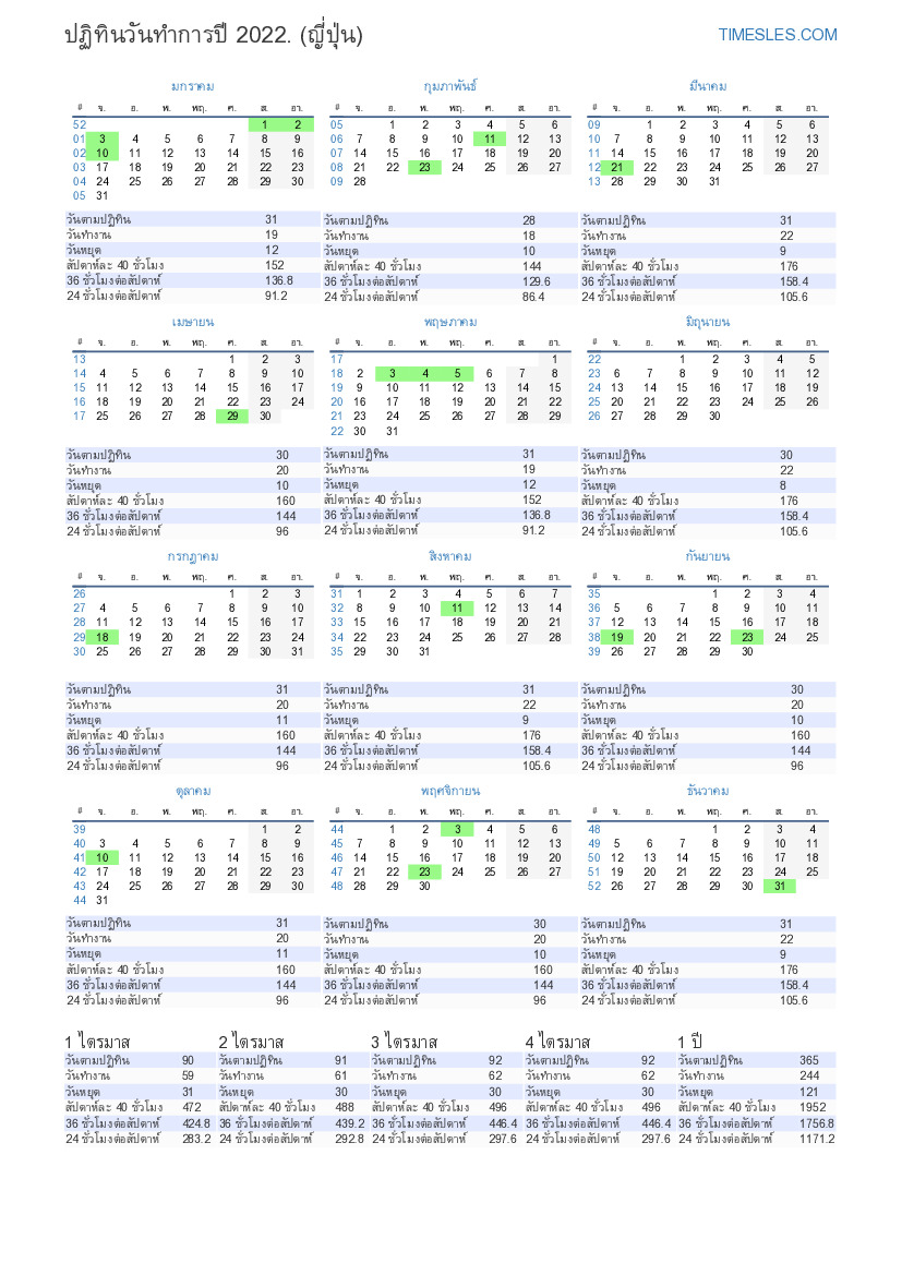 ปฏิทินวันทำงานแนวนอนสำหรับปี