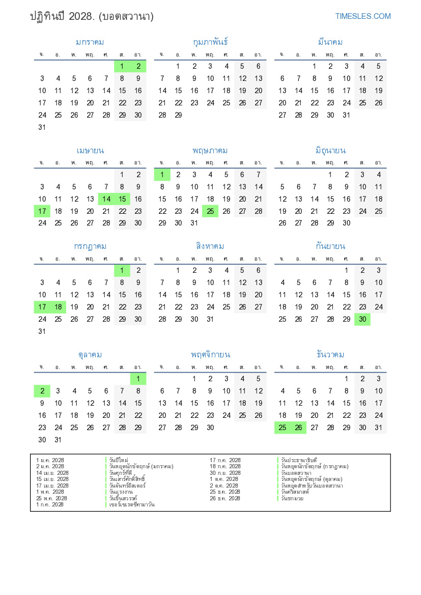 2 ม.ค. 2028 วันหยุดนักขัตฤกษ์ (มกราคม)