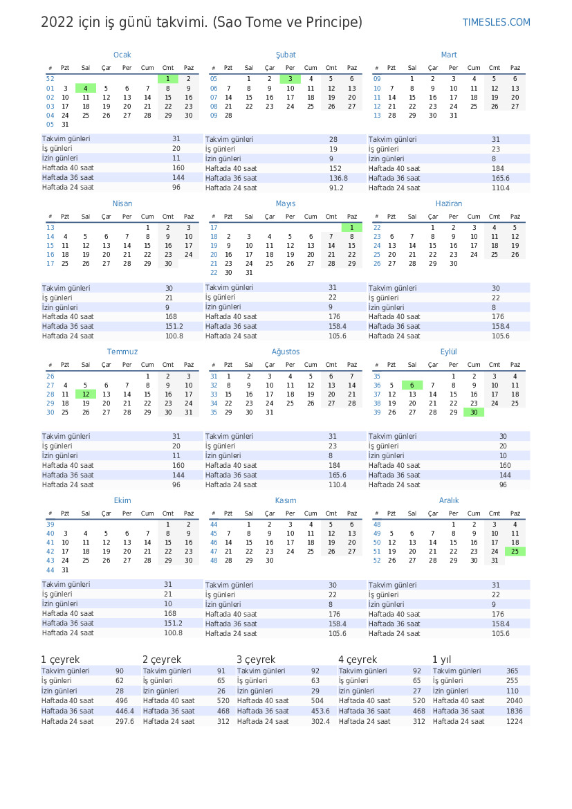 Sao Tome ve Principe için Ocak 2022 iş günü takvimi