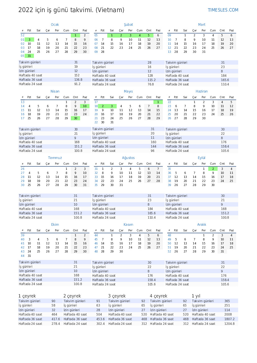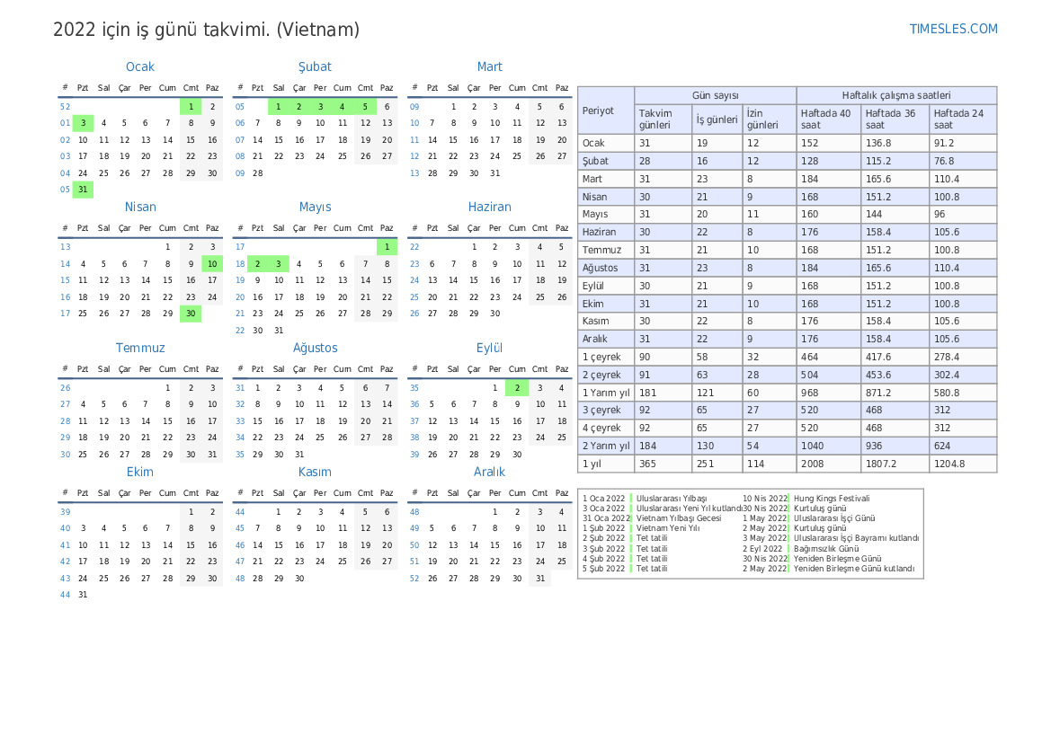 Vietnam için Aralık 2022 tatilleri ve hafta sonlarını içeren PDF iş günleri takvimini indirin ve yazdırın