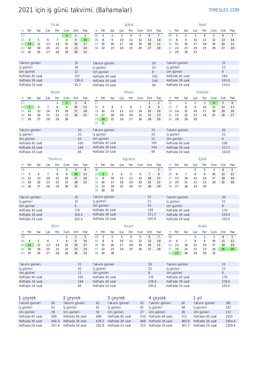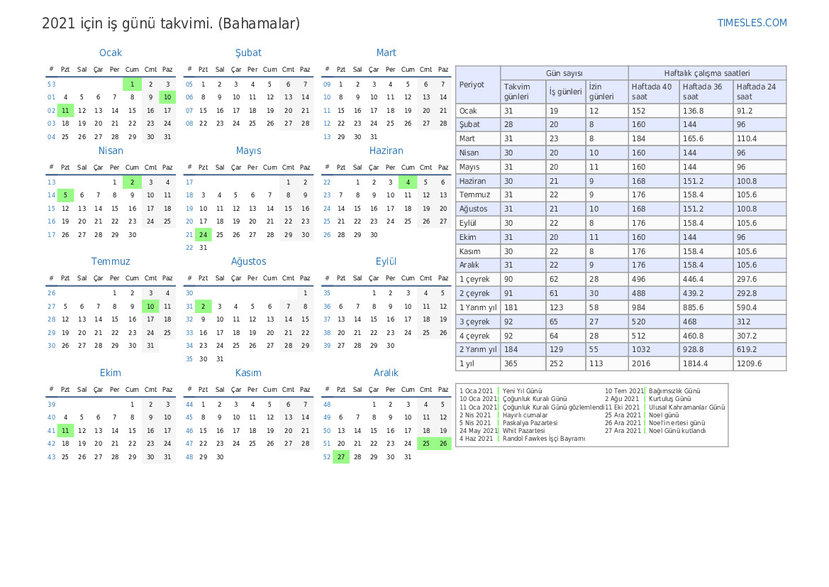 Bahamalar için 2021'nin 1. çeyreği için tatiller ve hafta sonları içeren iş günleri takvimi