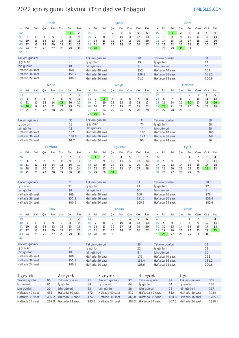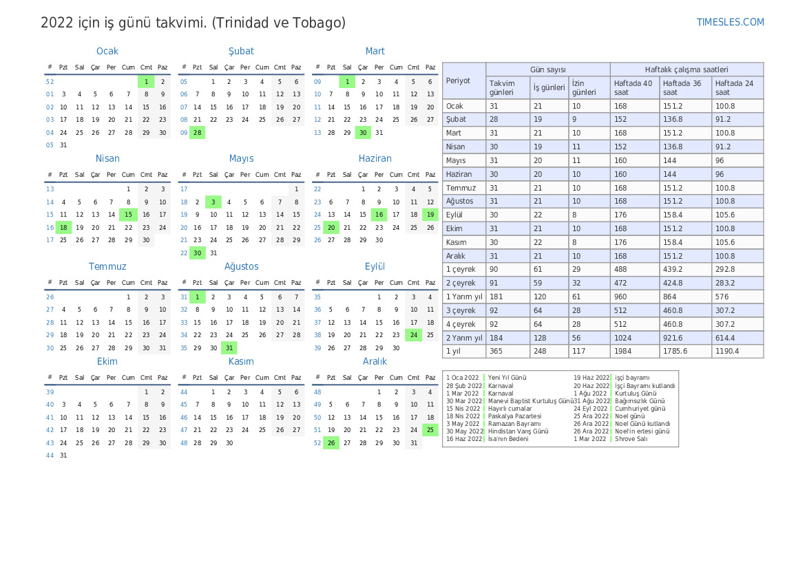 Trinidad ve Tobago için 2022'nin 1. çeyreği için tatiller ve hafta sonları içeren iş günleri takvimi