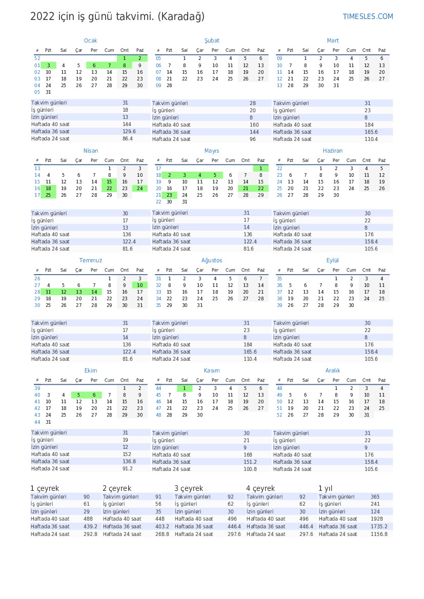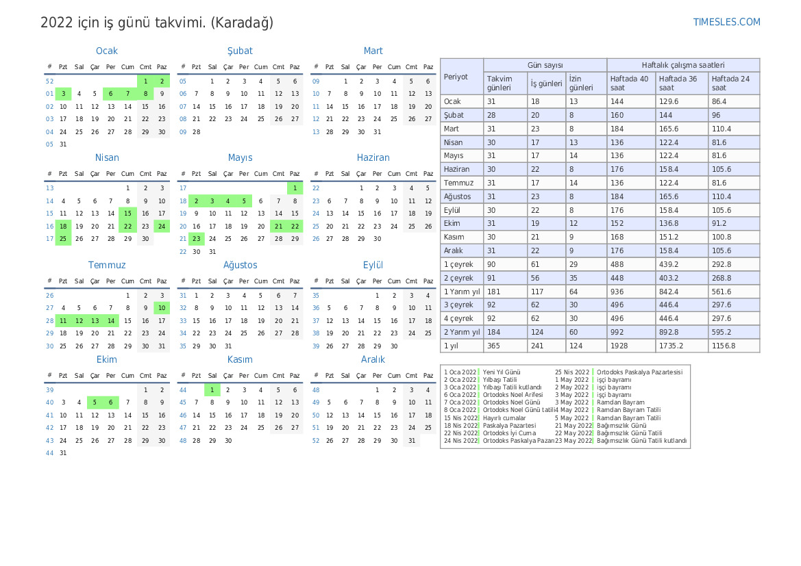 Karadağ için 2022'nin 2. çeyreği için tatiller ve hafta sonları içeren iş günleri takvimi