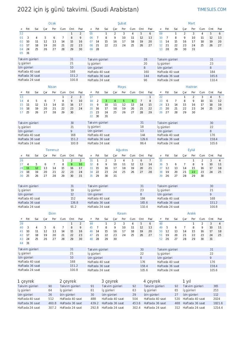 Suudi Arabistan için 2022'nin 2. çeyreği için tatiller ve hafta sonları içeren iş günleri takvimi