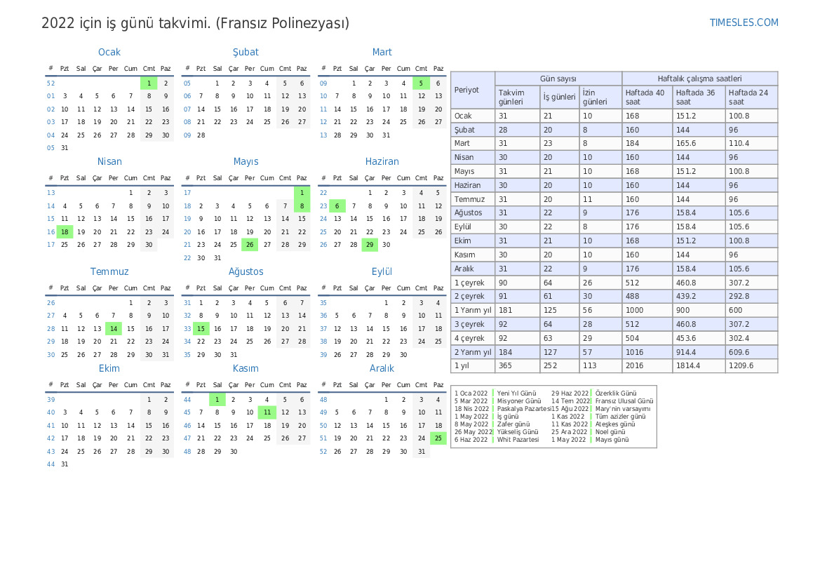 Fransız Polinezyası için 2022'nin 3. çeyreği için tatiller ve hafta sonları içeren iş günleri takvimi