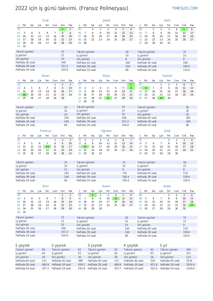 2022'in 3. çeyreği için Fransız Polinezyası'nda 3 tatil ve tatil günleri var. 2022'in 3. çeyreği Cuma gününde başlıyor ve Cuma gününde sona eriyor.