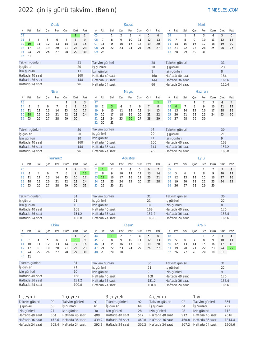 Benin için 2022'nin 4. çeyreği için tatiller ve hafta sonları içeren iş günleri takvimi