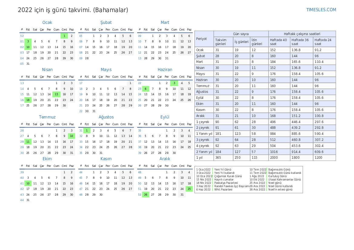 Bahamalar için 2022'nin 4. çeyreğine ilişkin tatiller ve hafta sonları içeren PDF iş günleri takvimini indirin ve yazdırın