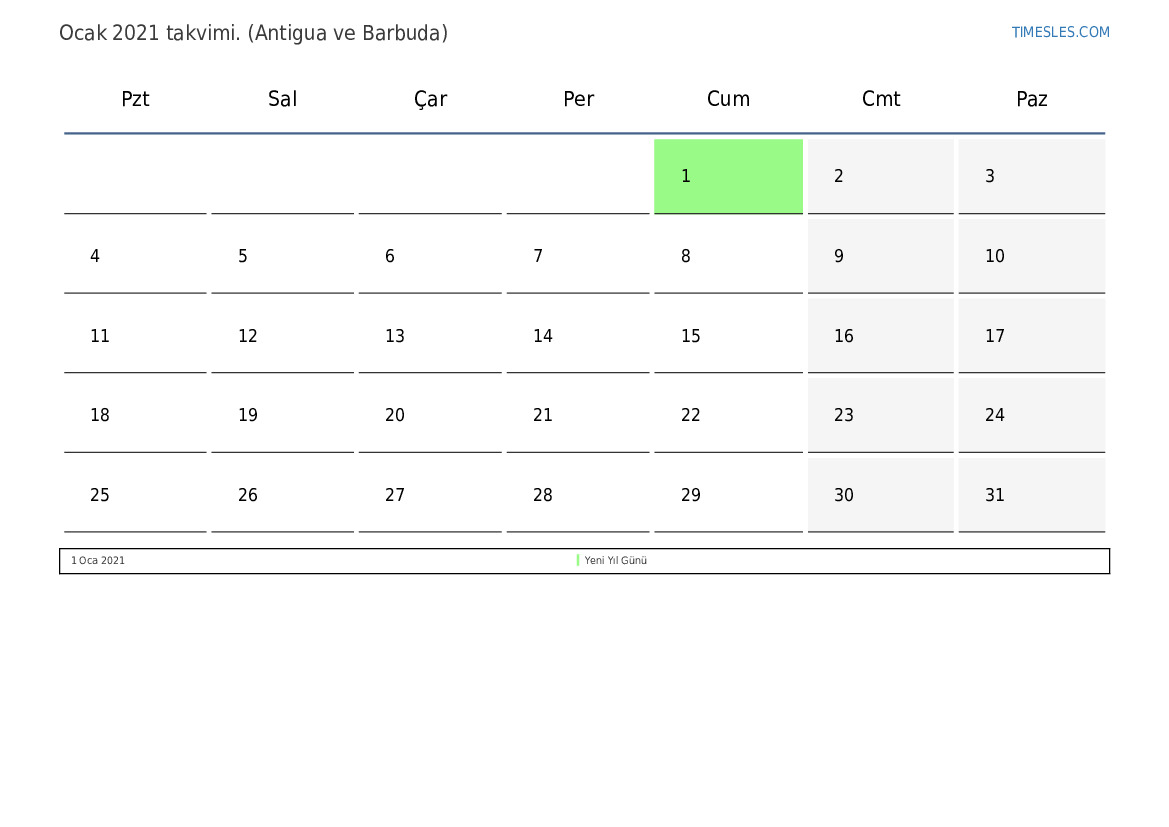 Antigua ve Barbuda için Ocak 2021 tatilleri ve hafta sonlarını içeren PDF takvimini indirin ve yazdırın